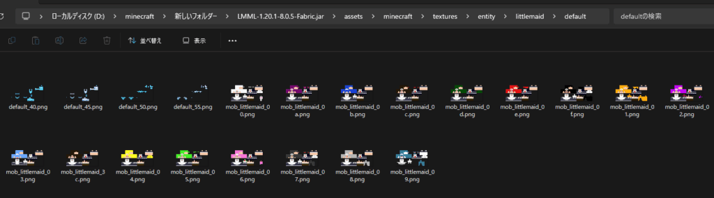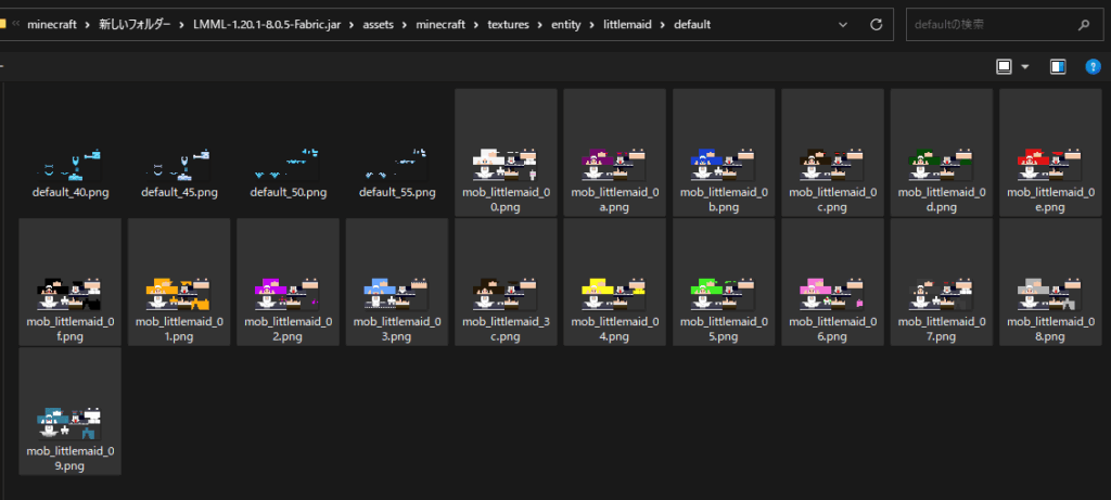 展開したフォルダの assets\minecraft\textures\entity\littlemaid\default 配下にデフォルトのテクスチャがあります。