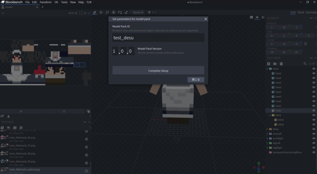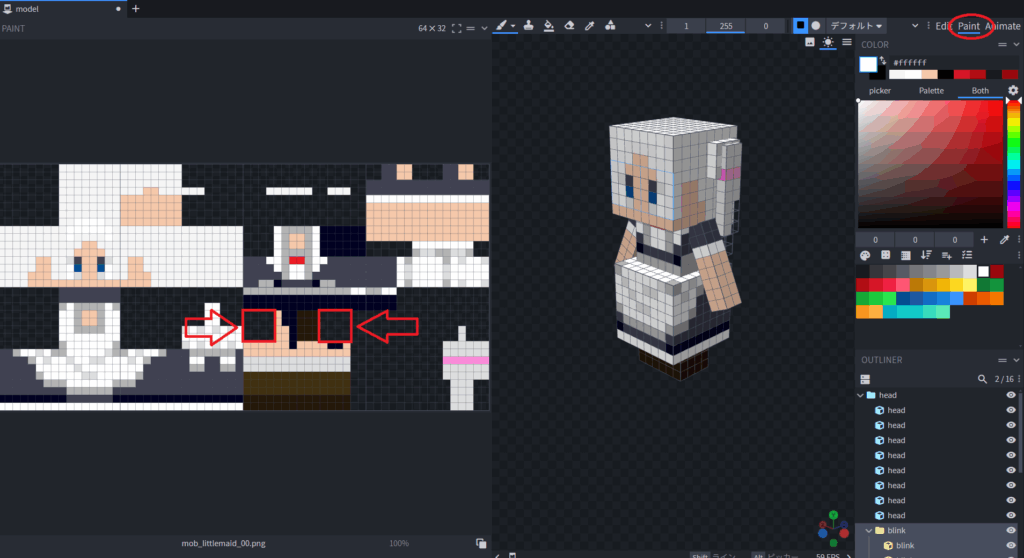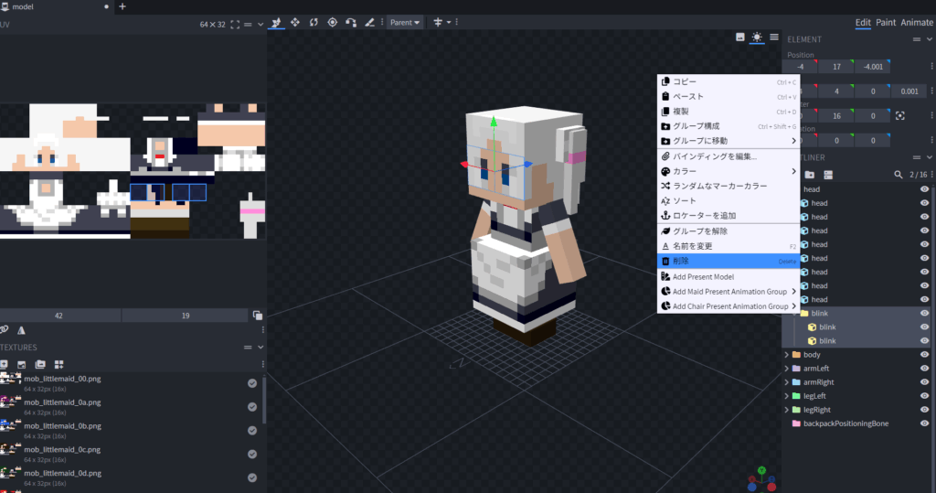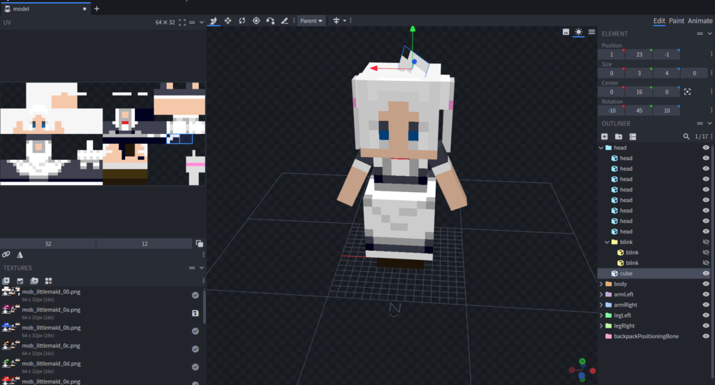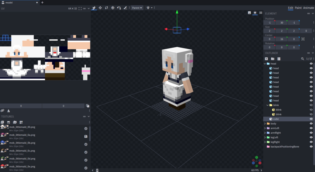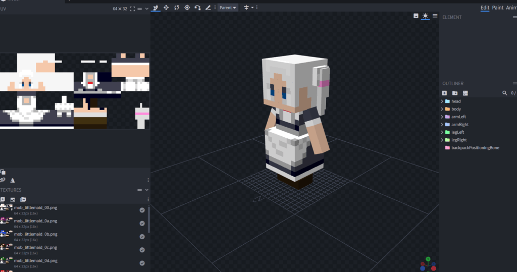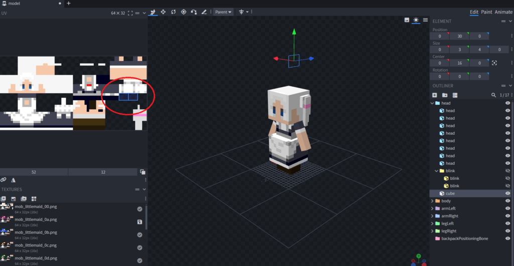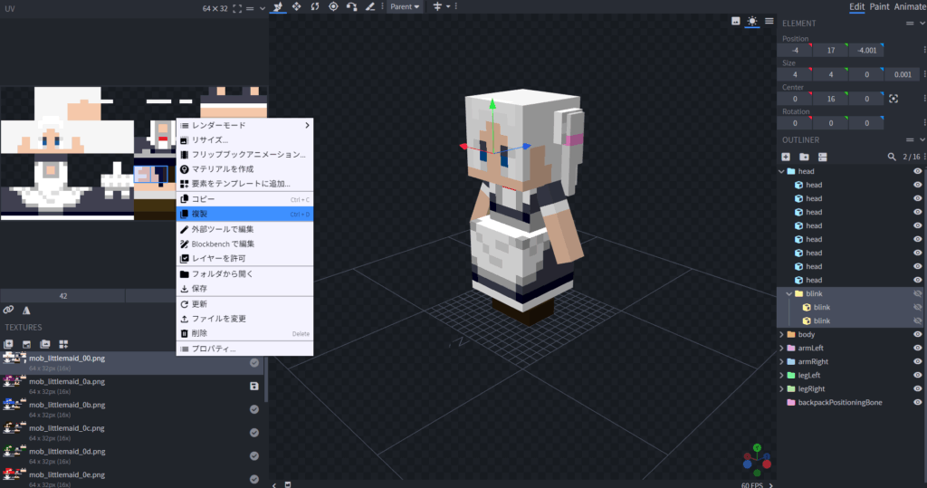 ただ、工業っぽい、魔術っぽい方が使っているメイドのテクスチャをパクリスペクトしたいので、blockbenchを使って追加します。
