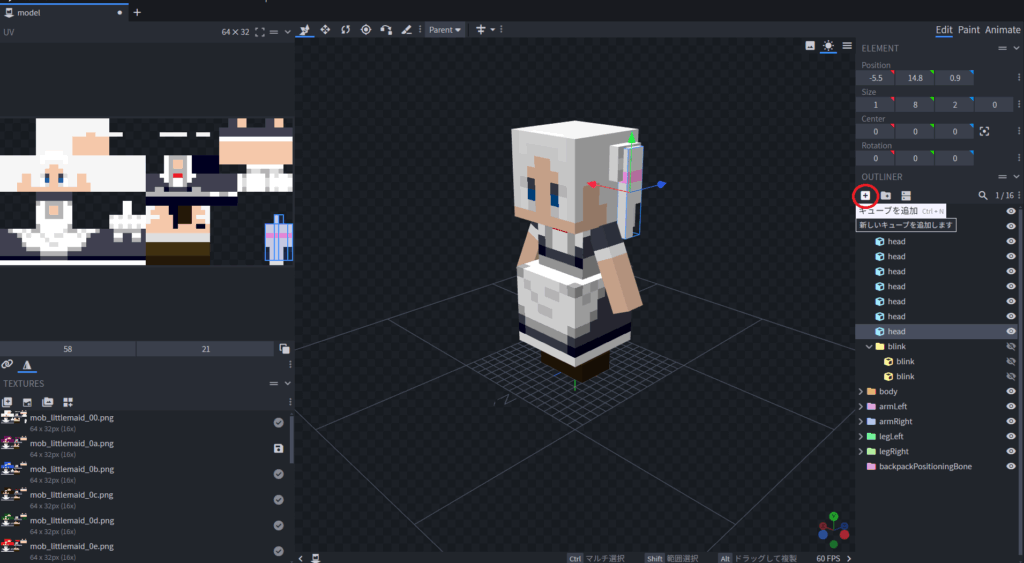 続いて頭についているあれを追加します。 (blockbench の使い方あってるかは知らない)