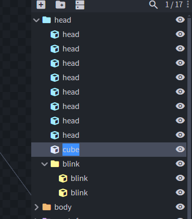 作成した cube を head 配下にぶら下げて、名前を head に変更すれば綺麗に見えるかと